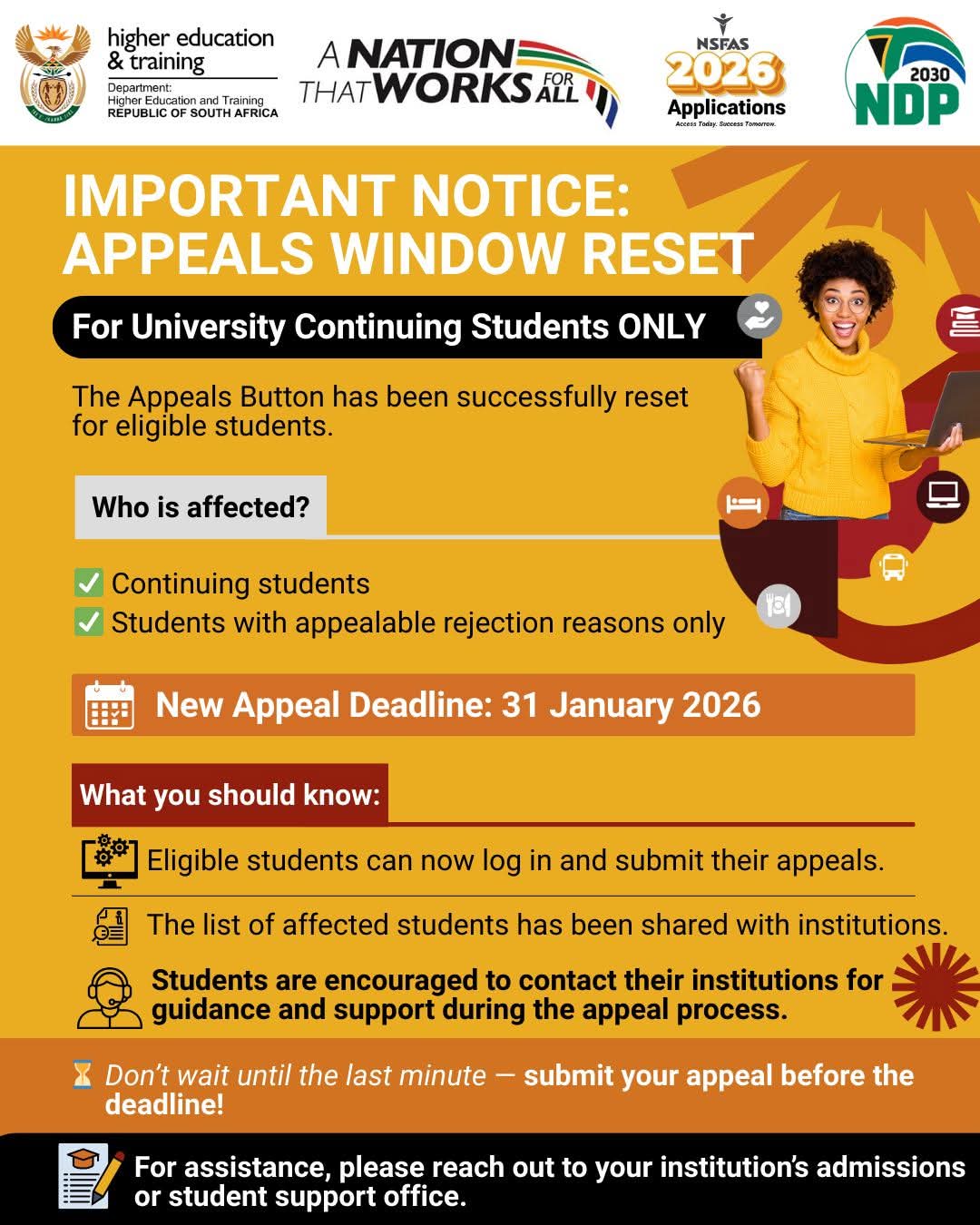 For students who have the option to submit NSFAS Appeals please see the attachment for the Appeals criteria and process to follow in order to submit Appeals to NSFAS through your online myNSFAS profile.