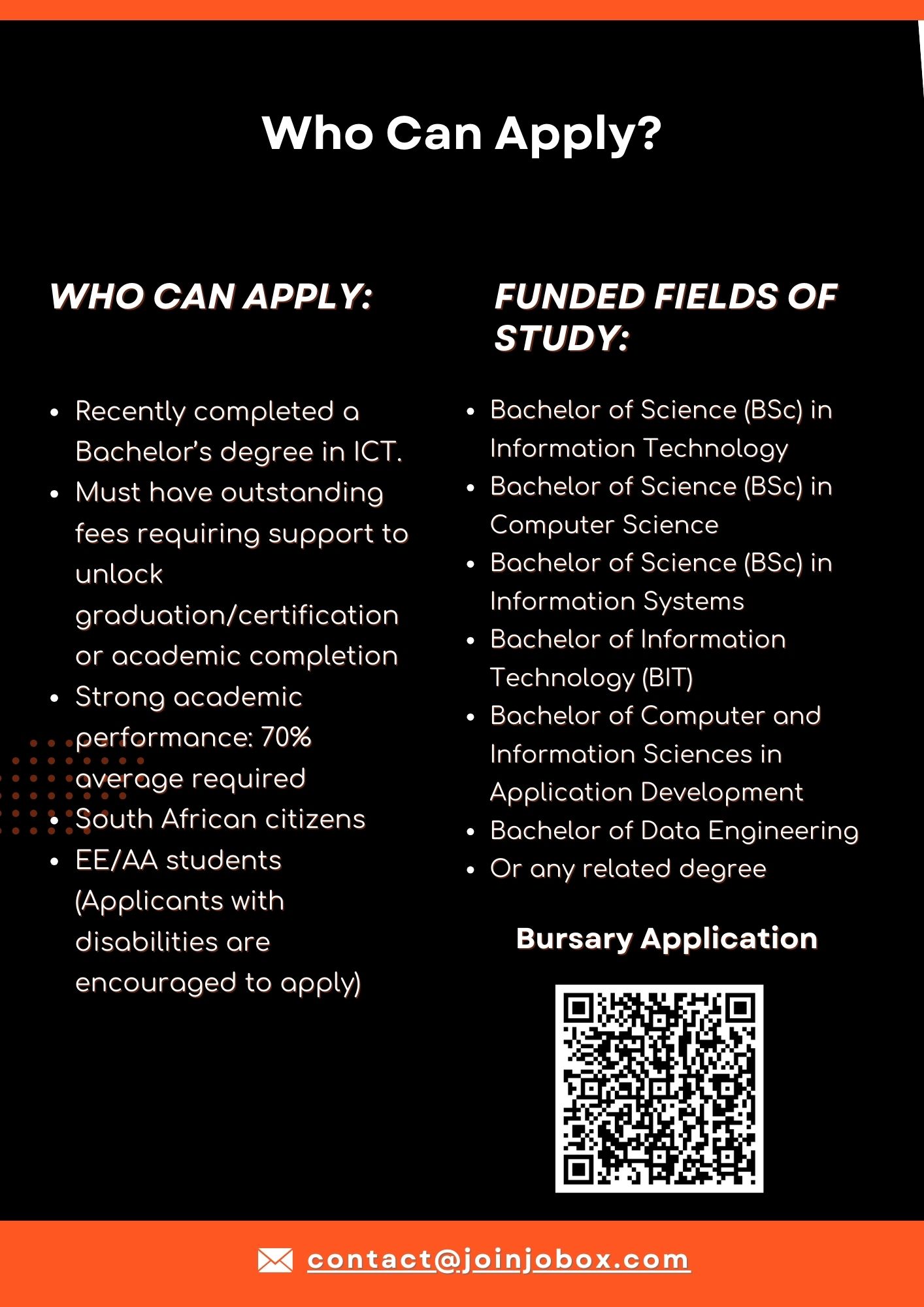 WSB Cares is offering bursary support to assist eligible ICT graduates with settling outstanding tertiary tuition fees that may be preventing them from receiving their qualification certificates. This support aims to remove financial barriers that hinder graduates from formally qualifying and fully accessing employment opportunities within the ICT sector, enabling them to confidently enter the job market and pursue meaningful career pathways.