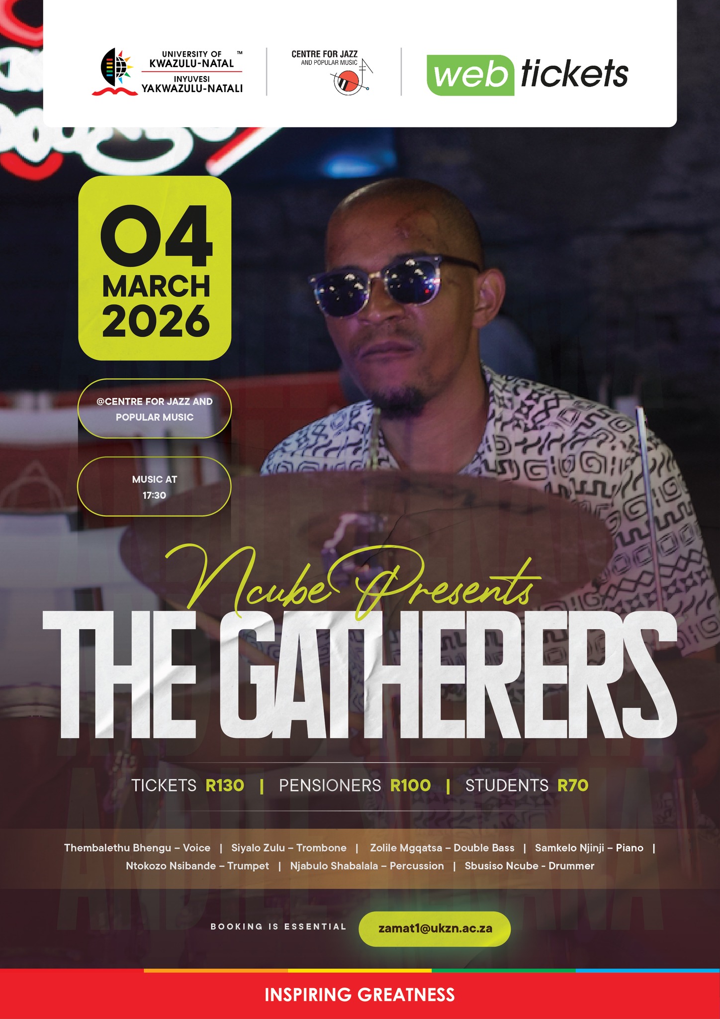The Centre for Jazz and Popular Music proudly presents The Gatherers, a dynamic jazz collective led by drummer and bandleader Sbusiso Ncube. The performance will take place on Wednesday, 04 March 2026 at 17h30 at the UKZN Jazz Centre.